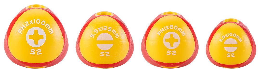 Set izoliranih odvijača 1000V, 4 komada, slim dizajn, idealan za profesionalce koji rade s električnim instalacijama. Ovi odvijači su izrađeni od visokokvalitetne S2 čelika, s toplinski obrađenim vrhovima za dodatnu čvrstoću i otpornost na savijanje. Tehničke specifikacije:
